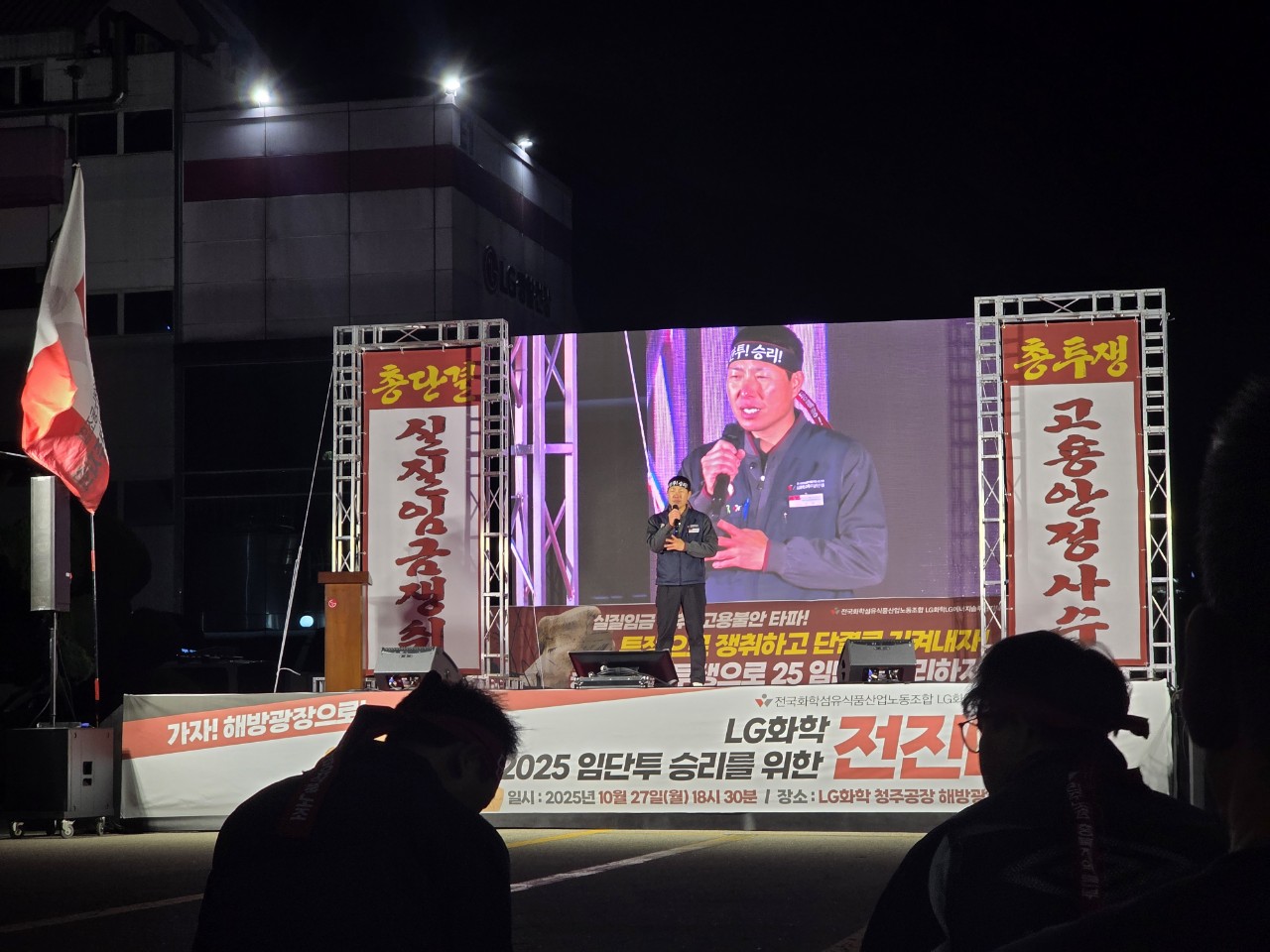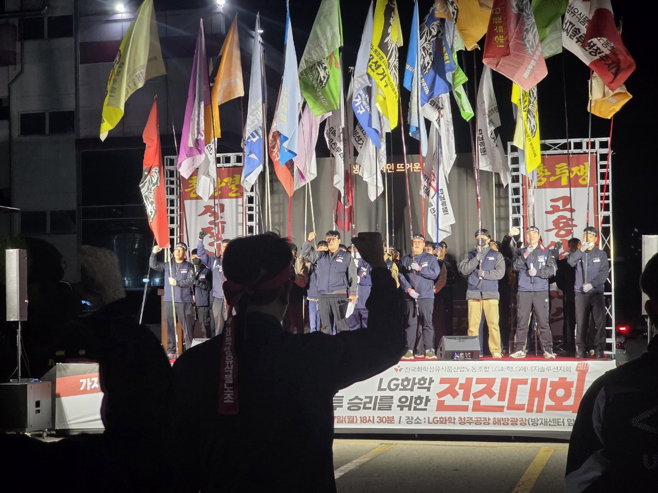 10월 27일(월) LG화학 청주공장 해방광장에서 진행된 LG화학 임단투 전진대회에서는 추운 날씨에도 불구하고 많은 조합원 동지들의 투쟁 결의가 힘차게 울려퍼졌습니다.